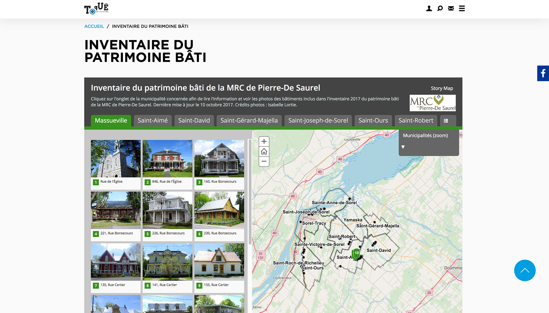 La MRC de Pierre-De Saurel procédait cet été à la mise à jour de son inventaire du patrimoine bâti. Le travail est maintenant terminé et le résultat peut être consulté sur le site http://www.toquedeculture.com/inventaire-du-patrimoine-bati/. Cet inventaire visait essentiellement les noyaux villageois, Saint-Joseph-de-Sorel et quelques secteurs périphériques de Sorel-Tracy.