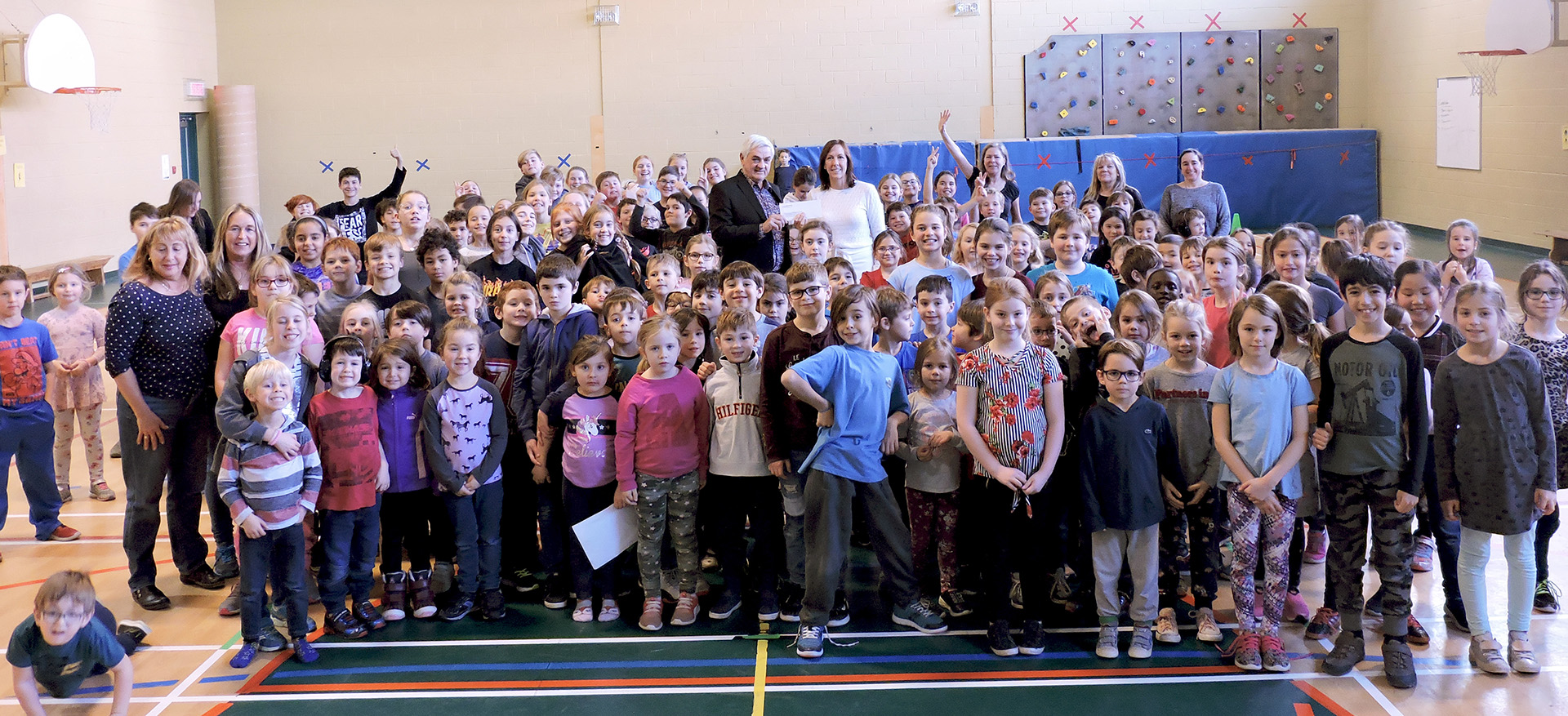 Sur la photo : Le préfet de la MRC de Pierre-De Saurel, M. Gilles Salvas et la directrice de l’école Maria-Goretti, Mme Dominique Dussault, entourés des élèves fréquentant le service de garde de l’école.
